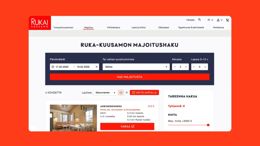 • Käyttökokemuksen parantaminen: Uudistuksessa laajennettiin olemassa olevaa käyttöliittymäsuunnitelmaa ja luotiin uusia laskeutumissivuja majoituksen varausputken käyttökokemuksen parantamiseksi.